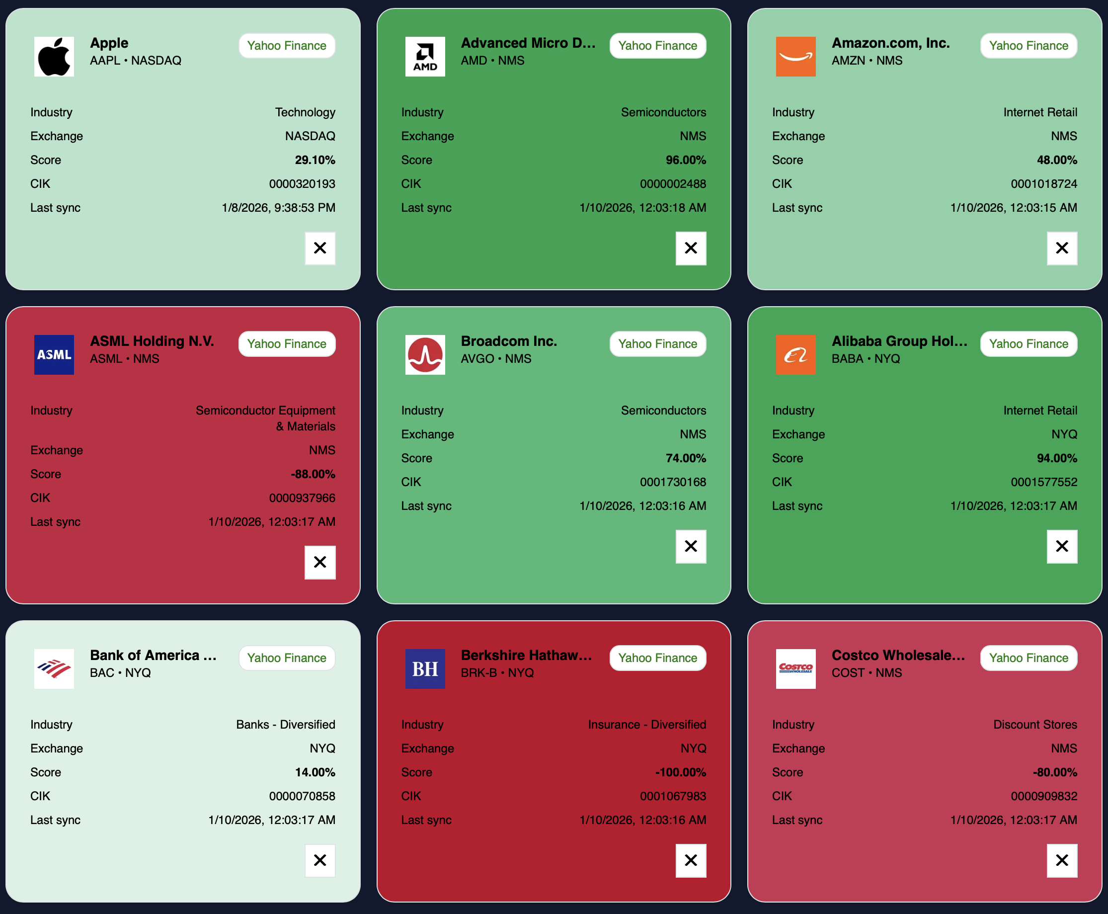 Our model assigns a score to each stock based on its predicted performance. This performance is in the range of -100% to 100% The lower the score, the more likely the stock value is to decrease in the future. The higher the score, the more likely the value is to increase. The closer to zero, the more uncertain the model is about its future performace.